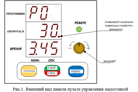 Енкодер містить вбудовану кнопку перемикання вибору корекції (задавання) швидкості або часу обертання ротора медової тканини. Натисканням ручки енкодера можна вибрати режим корекції швидкості або часу обертання ротора мідної частини. Вибір режиму корекції швидкості обертання підтверджується ввімкненням точки в останньому розряді індикатора швидкості (див. рис.1).